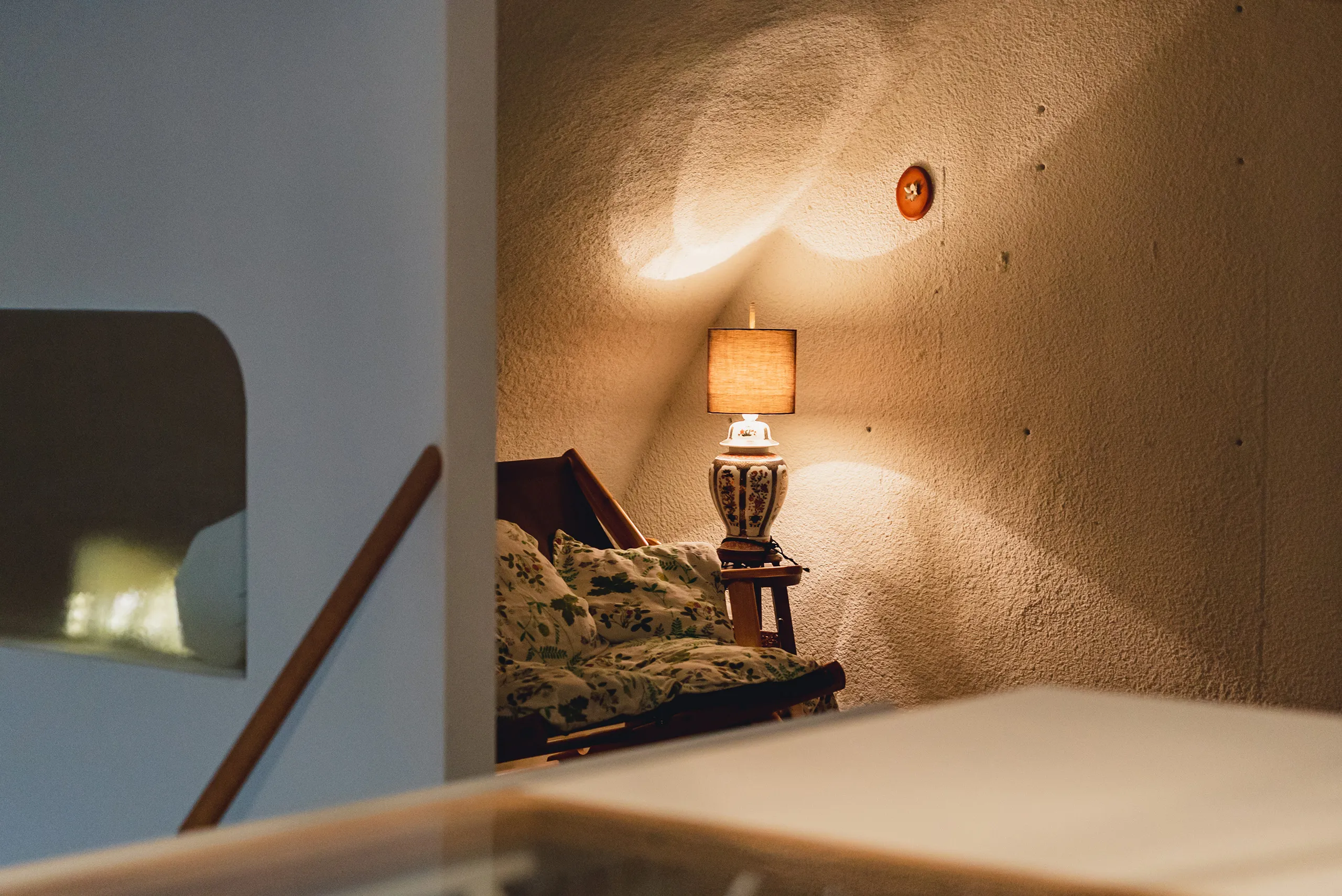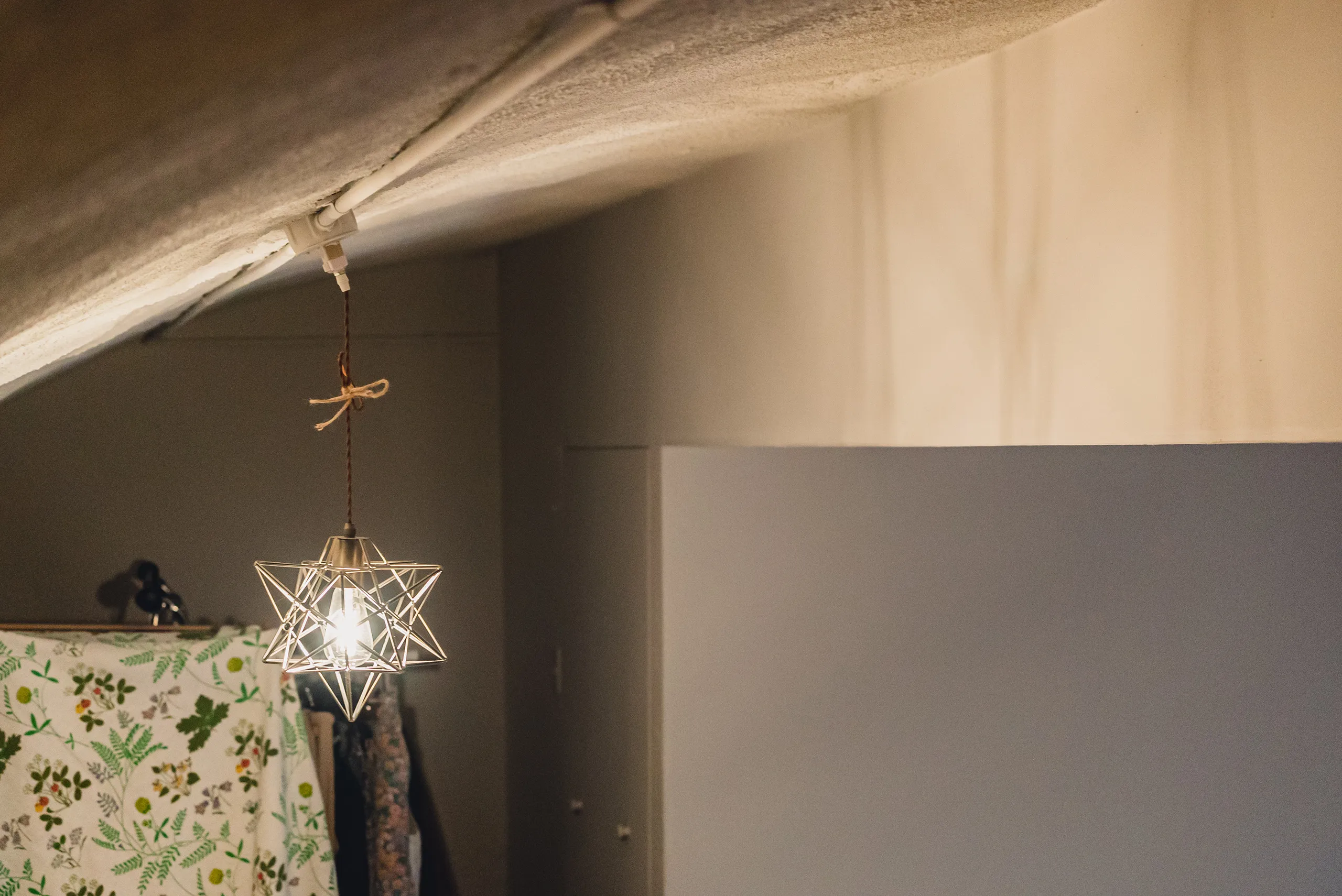 引き渡し後しばらくして、竣工写真を撮りに伺ったのは、ちょうどクリスマスの時期だった。季節を意識してそれとなく飾られている赤や緑の小物と、改修前から変わらずある、過去に訪れた美術館のチケットをストックしているコルクボードや可愛らしい時計のオブジェが、改修後新設された棚に並んでいた。ロフトの窓越しに見える天使の羽も、よく見覚えのあるものだった。アールがかった低いロフト天井の表情が際立つように照明が吊り下げられたり置いてあったりした。それらを見て嬉しいのは、改修後の部屋と施主との間に、私が設計段階で意図できるはずのなかった物語がいくつも生まれていると感じられるからだ。自分との間に物語を紡げる対象に対して人は愛着を持つということを改めて感じた。当事者ではない設計者は全ての物語を描き切ることはできないし、設計者に描かれた物語はフィクションでしかない。設計者にできるのは観察すること、そしてそれを記録すること、それらを土台として、使い手が主体的に物語を紡ぐことができる対象をつくることだと思う。