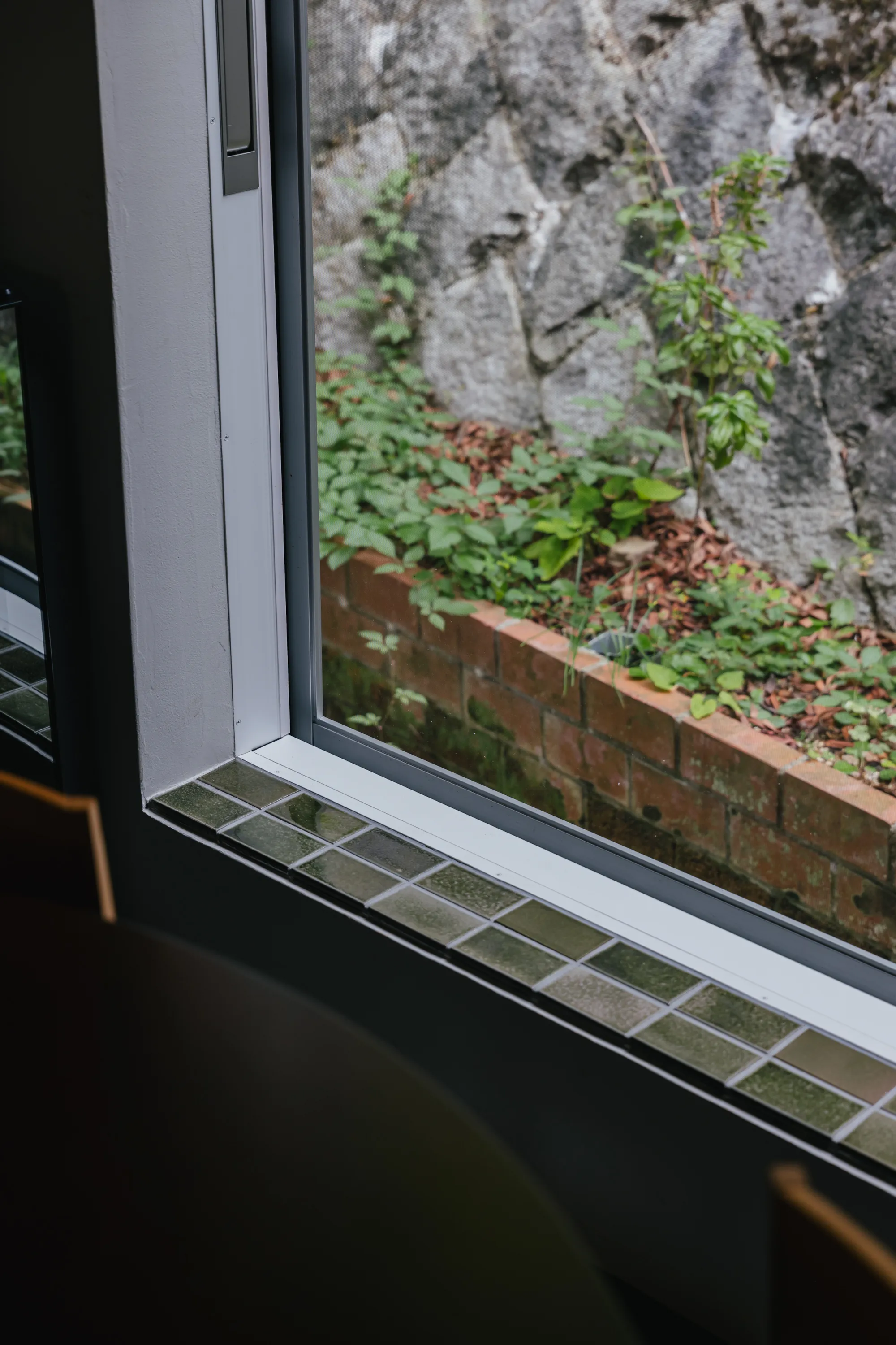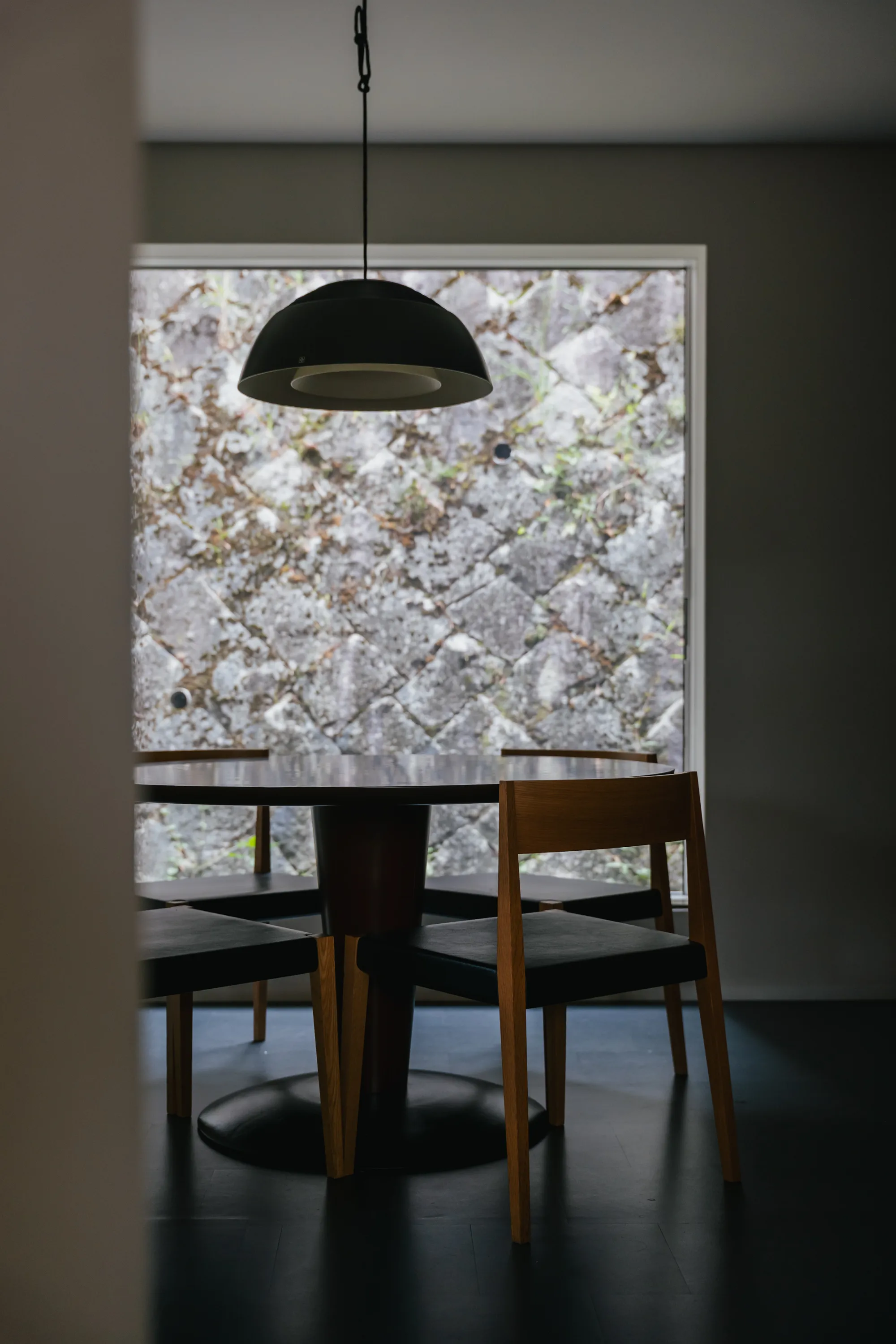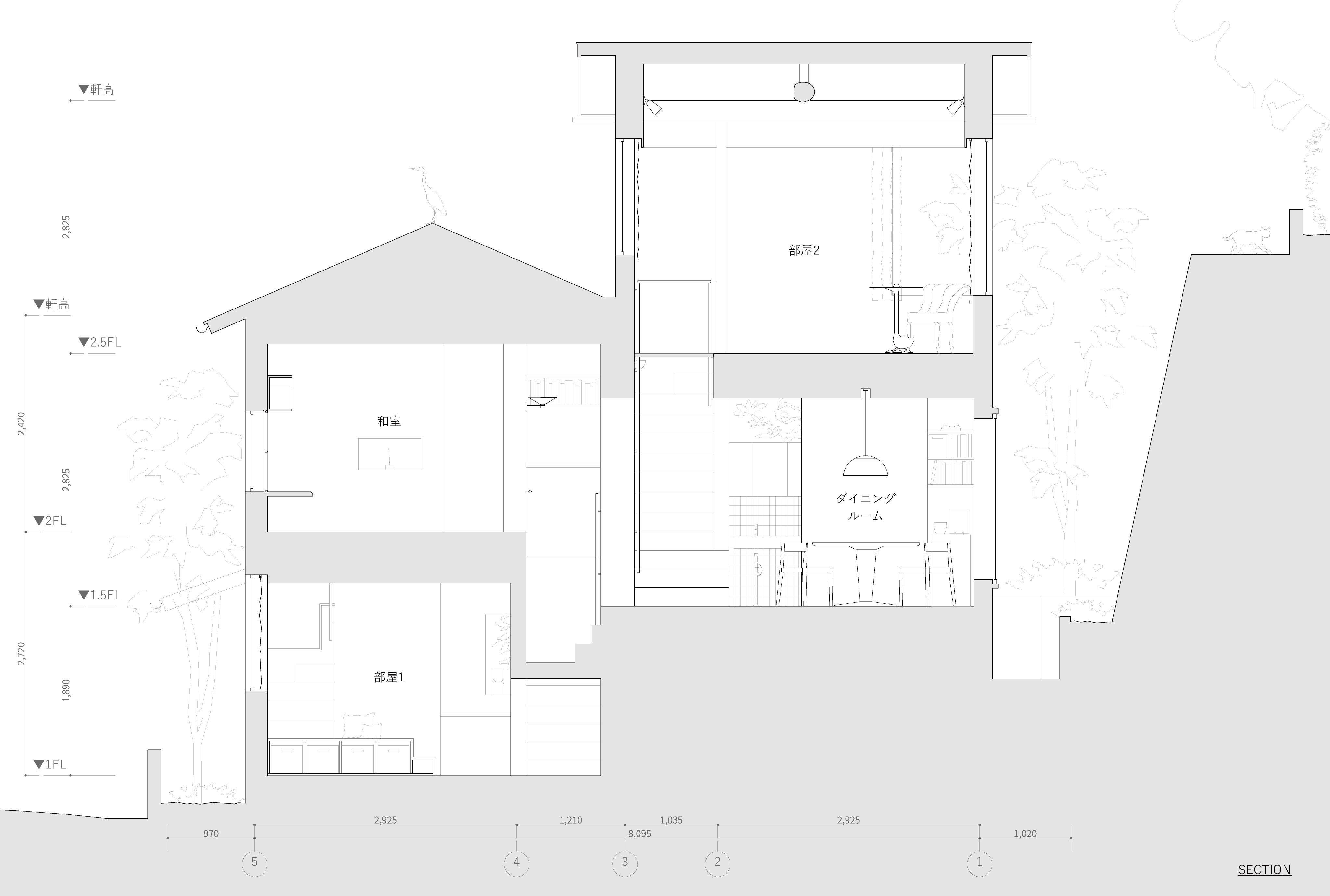 北窓からのささやかな光が曲面の壁面を伝う玄関から1.5階へ上がると、各部屋からの間接光で徐々に明るくなり、ダイニングルームへと繋がる。ダイニングルームは、朝から昼過ぎまで擁壁からの柔らかな反射光で満たされる。窓を開放すれば擁壁を伝ってきた風が2階の和室や書斎まで通り抜け、階段やキッチン上部の吹き抜けからは2.5階から明るい光が降りてくる。道に面した2階の和室は、風を通す障子兼室内網戸やアオダモの木により外部との程よい距離感が保たれ、床座に丁度良い高さの手摺は、ダイニングルームと和室を遮ることなく一体的に感じさせる。そして長い時間を過ごす2階の書斎からは、1階の「部屋1」、1.5階の「ダイニングルーム」、2.5階の「部屋2」まで視線が通り、別々の空間にいながらも互いの気配を感じられ、窓からは家の前の曲道を行き交う人々や猫の様子が目に入ることで、近隣とのささやかな交流が生まれる。最上階の2.5階の窓には、隣家の庭園、南東側の山、近隣のランドマークである大木など、周辺環境が切り取られ、視覚的な景色だけでなく、ベッドに隣接した東側窓からは朝日や木々がそよぐ音、鳥や虫の鳴き声が入り込み、裏山の緑や土の匂いを運ぶ風が、北西角の窓へと部屋を通り抜けていく。