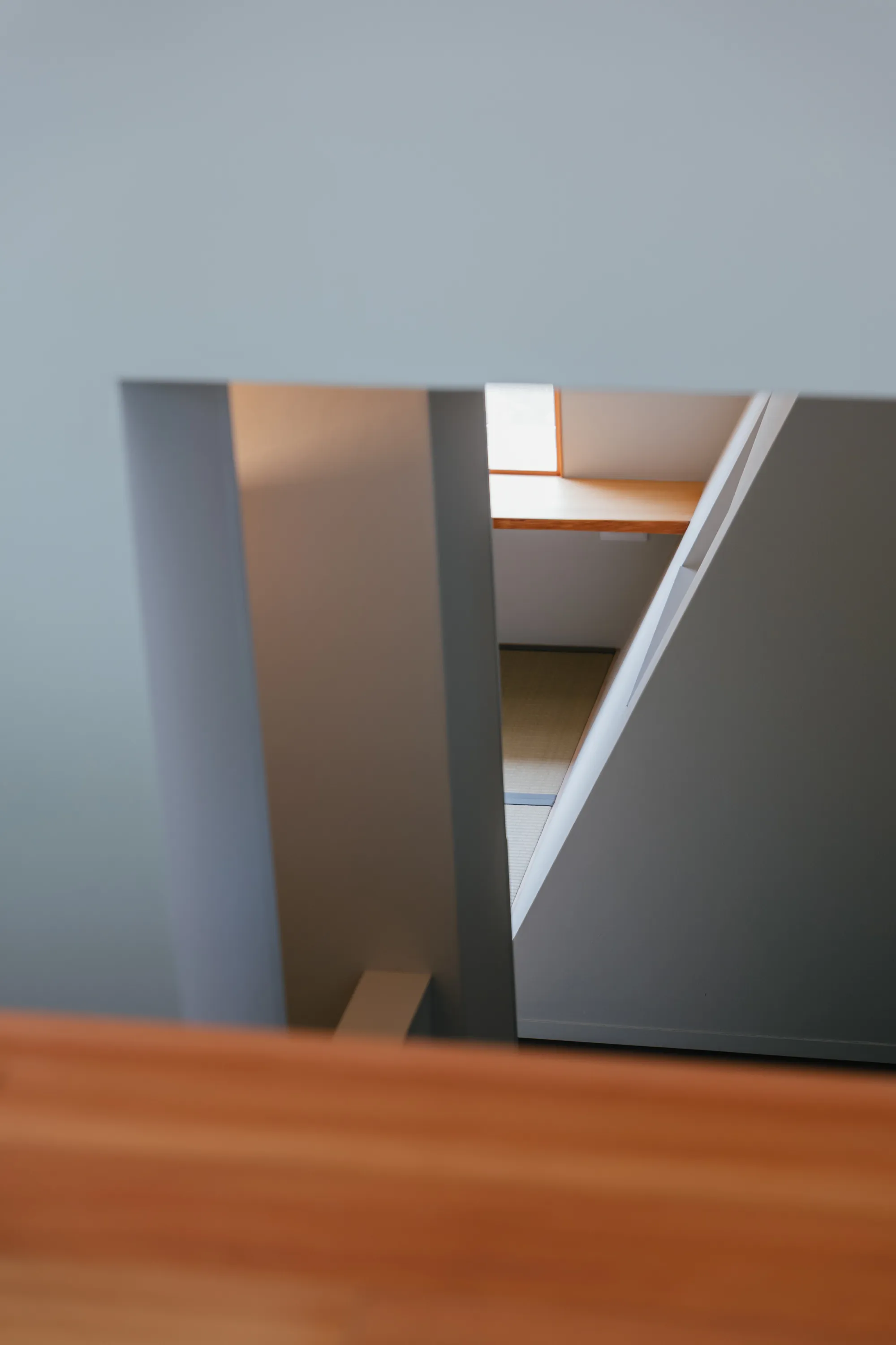 各層のレベル差による空間の表面積を活かし、実際の床面積以上に奥行きのある空間体験を作りだすため、既存の主要な構造に干渉しない範囲で、各部屋を区切る壁を間引き、複数の部屋が繋がりながらも分かれている状態をつくった。2棟の建物や各部屋の境界をより曖昧にするため、壁天井は隔てなく珪藻土で仕上げ、接合部の分厚い壁には所々に生活の拠り所となるニッチを設けた。手摺は各空間を横断するように縦横に延長し、各室を仕切る引き戸は開け放した際に存在が目立たないよう枠のない引き込み戸としている。
