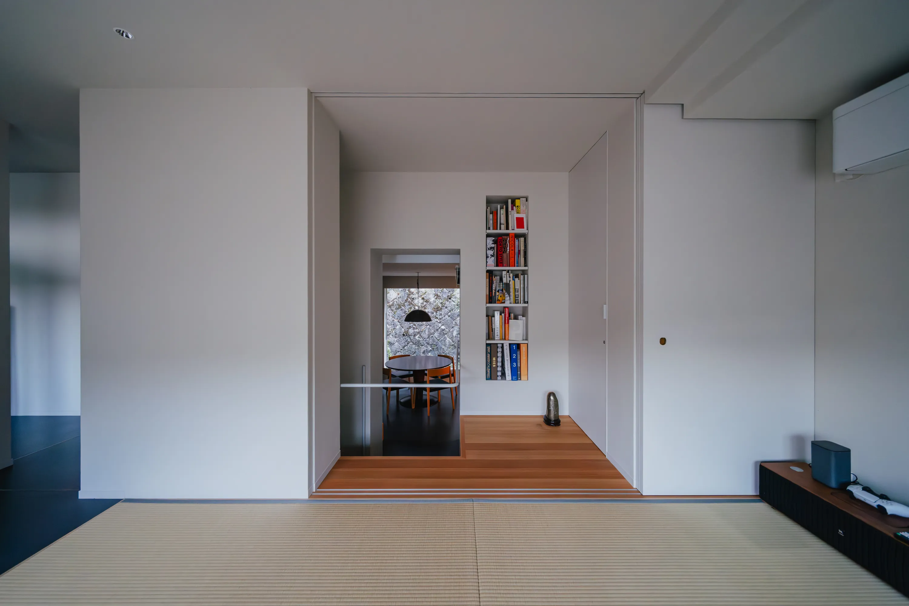 この引き戸を開け放てばどこにいても時間による光や風のグラデーションを感じることができる大空間となり、閉めれば自由な組み合わせで2つのメゾネットとして独立させられる。具体的にはゲスト滞在時は、「部屋1」と「書斎」を私たちのプライベートスペースとし、「部屋2」と「ダイニングルーム」をゲストスペース、「和室」は状況に応じてどちら側にもセパレートできる柔軟な設えとしている。ゲストと私たちの動線を分けるため、玄関以外で交わらないよう屋内階段を新設し、1階の「部屋1」と2階の「書斎」を動線的にも空間的にも接続した 。さらに、玄関を軽飲食店舗としても活用できるよう、隣接する階段下にトイレを、玄関を上がって突き当たりにミニキッチンを配置し、住居スペースとは引き戸で分節する。