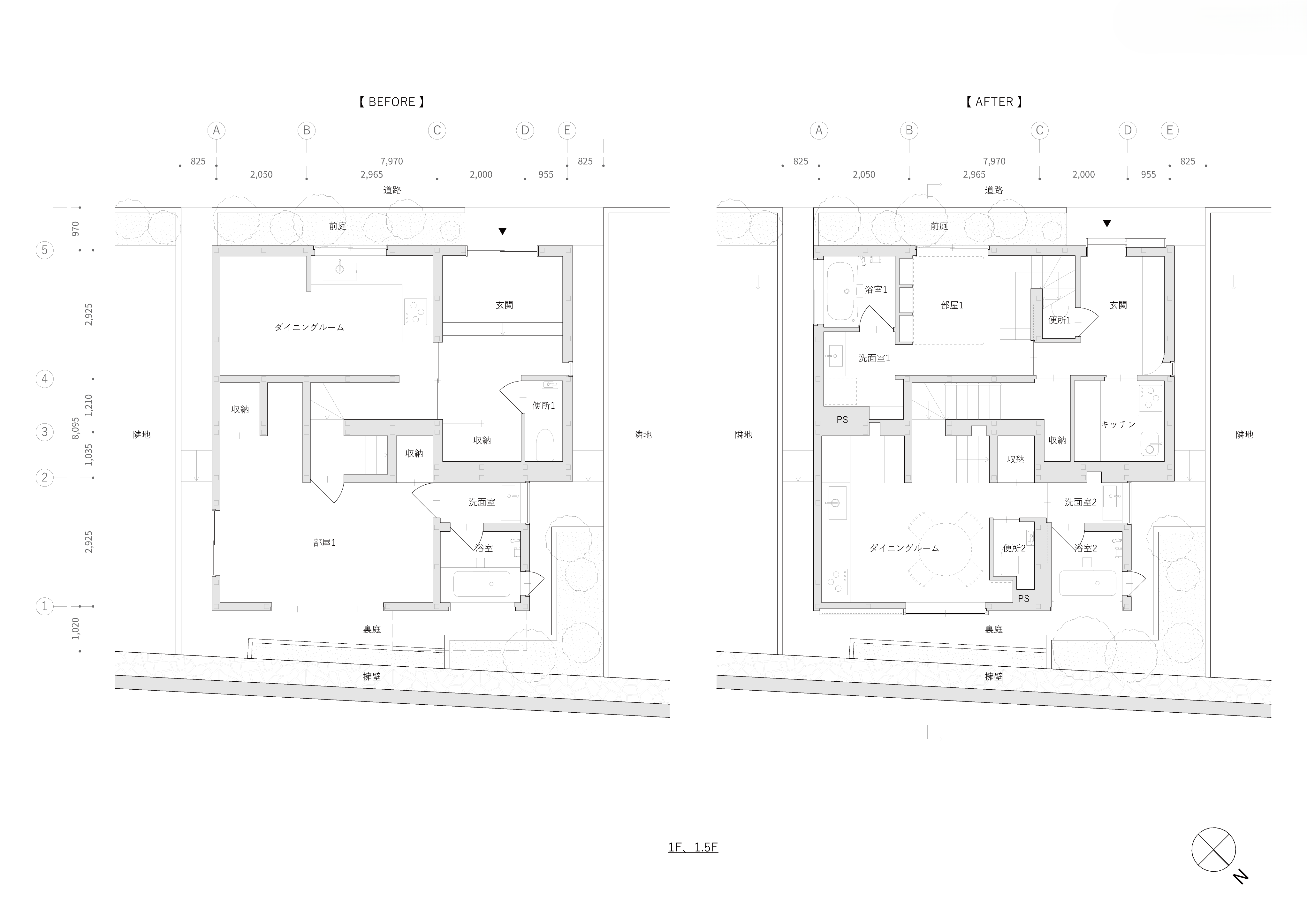 本改修計画は、2つの家屋が最低限の手間で接合された既存建物やその周辺環境に対して潜在的な価値を再発見し、内部区画の前提をとりはらうことで現れた一つの大空間をその外部まで心理的、機能的に拡張・再構築したものである。階段を中心とした各区画への回遊性が、元の増築による風通しの悪さを改善し、時にプライベート/ゲストなど複数の関係性を自由に結ぶ道となり、時に障子のような仕切りによって実体のある住まいとなる。120㎡という面積の中で多様な機能を持たせつつ空間の可変性を追求することで、私たちの豊かな暮らしを包み込む、多機能住居の提案である。
