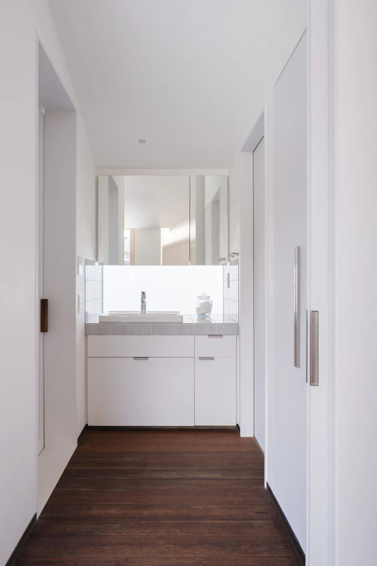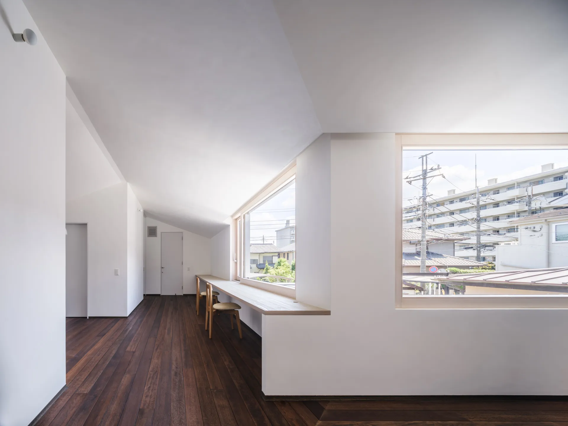 この住宅では、敷地奥まで南側から採光が取れるように計画したL字型のボリュームの隅に個室を配置していき、室の間に水回りや共有部を設けた。それにより、単に廊下に面して並ぶ従来の個室ではなく、個々の部屋の独立性を保つと共に、扉を開ければ共有部と連続した空間として感じられるような住居を設計した。音やプライバシーの確保といった要求に壁を立てるのではなく、室の配置によって家族の距離感を調整してゆき、個室・共用部の二項対立を崩していくことを意図した。