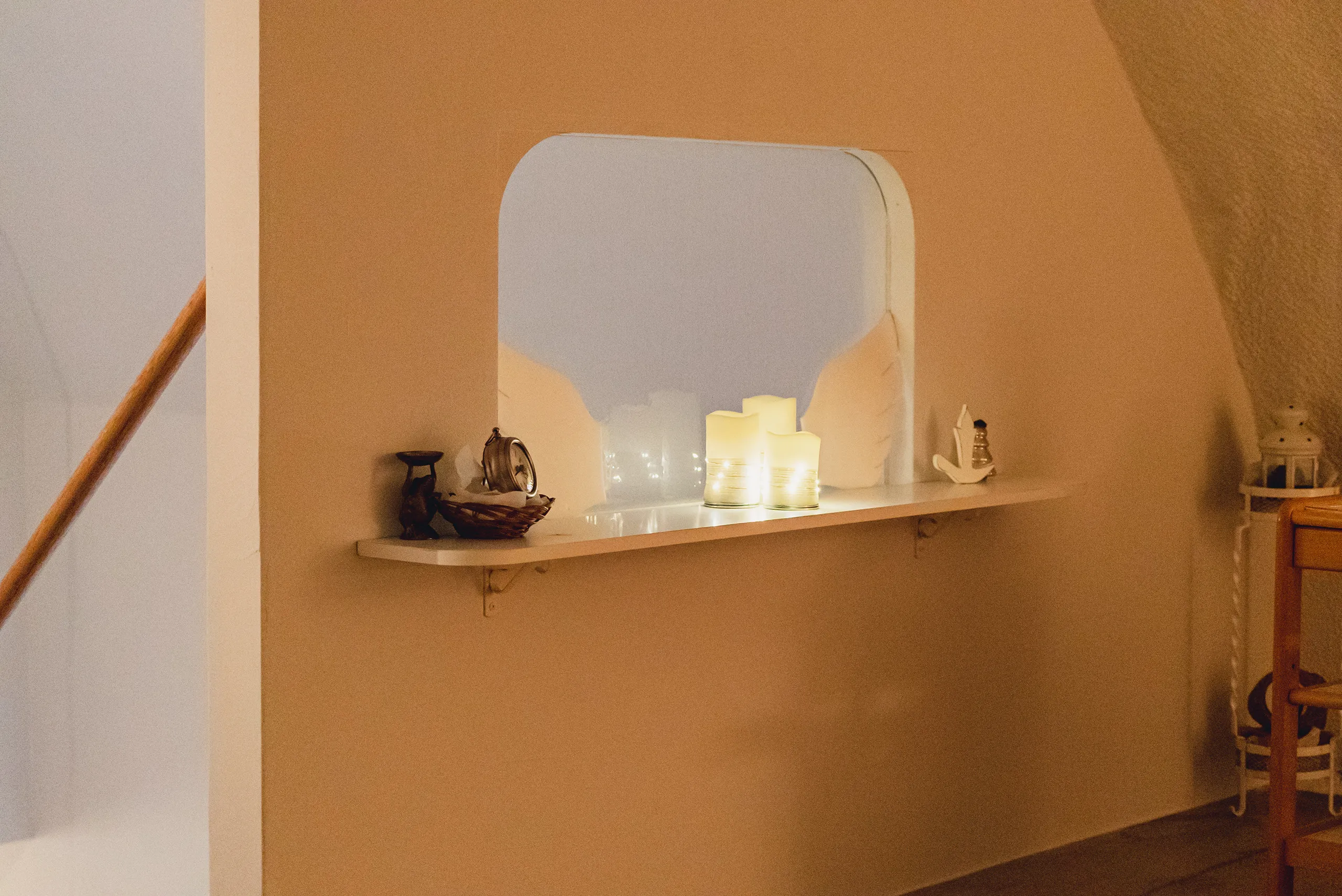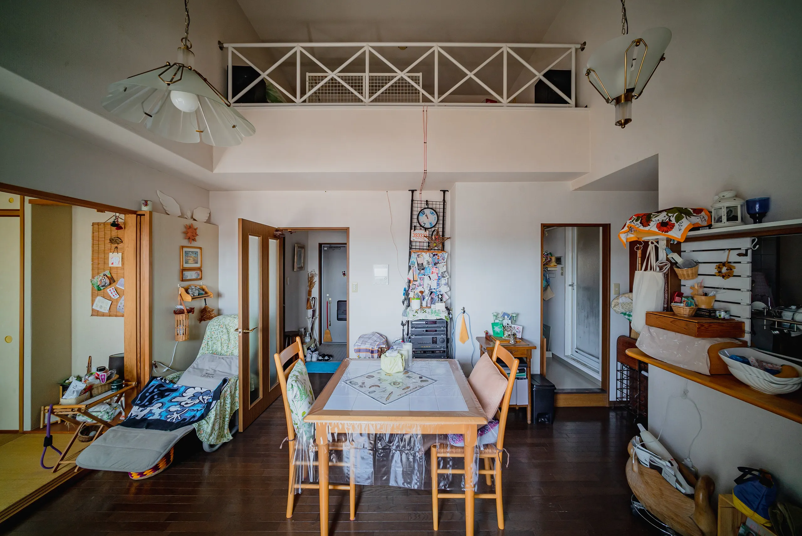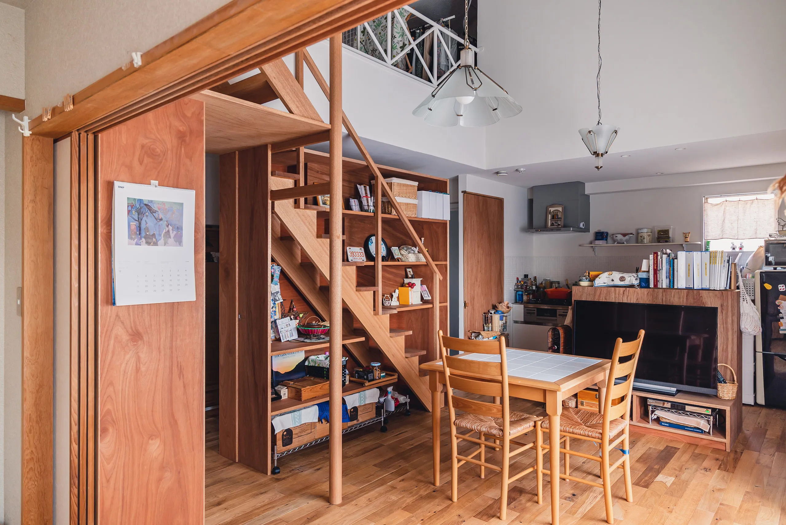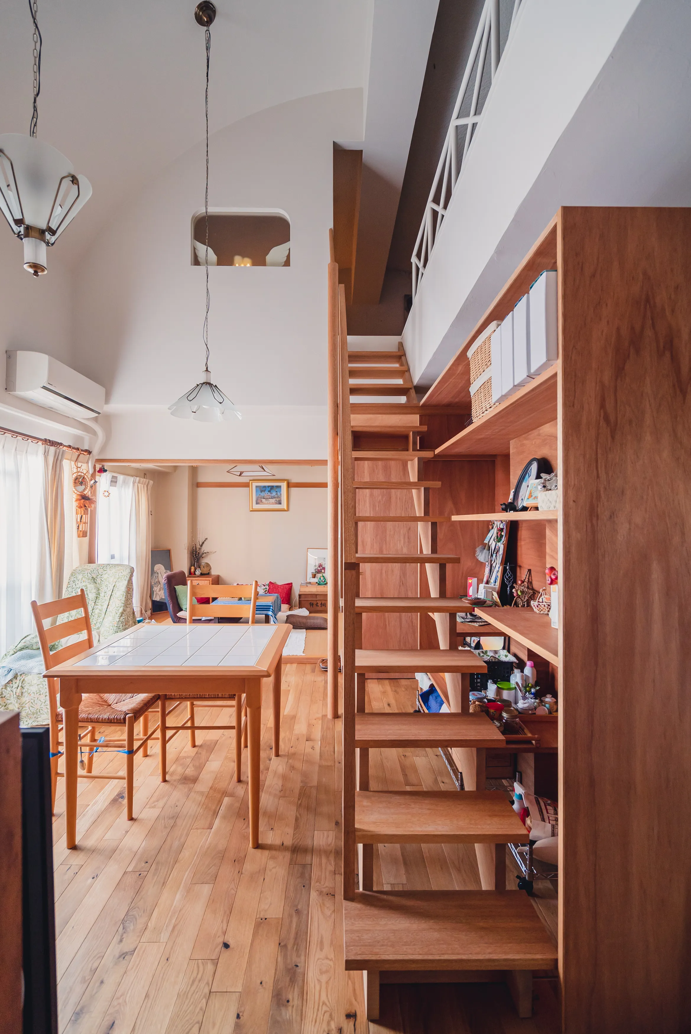 To optimize the limited living room space, we designed a custom partition incorporating integrated storage for collectibles and records. Crucially, this partition features a pull-out staircase that can be extended only when needed to access the loft. This design allows for flexible space division and connection as life evolves, creating a space that not only functions efficiently but also beautifully reflects the client's accumulated years and memories within their home.