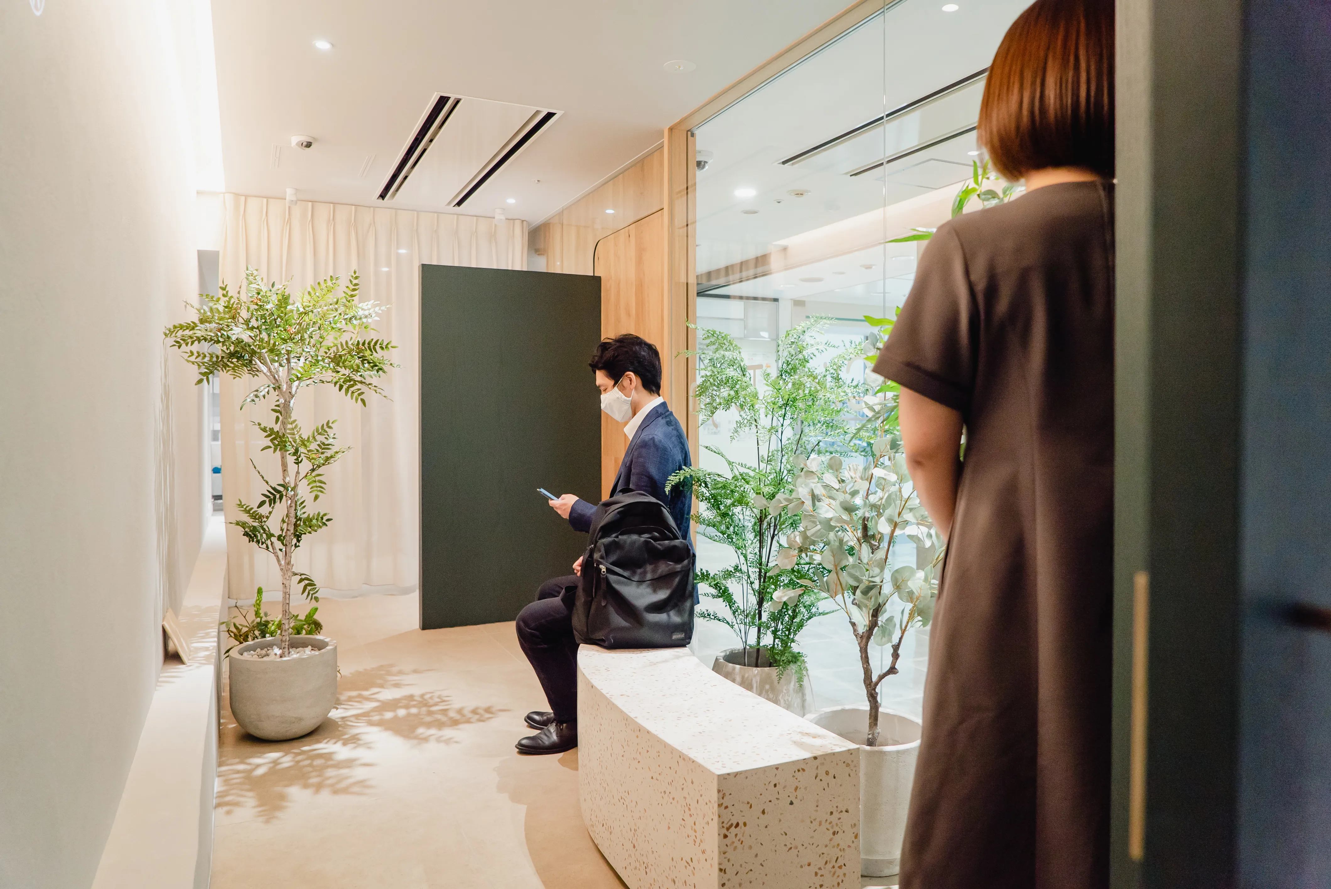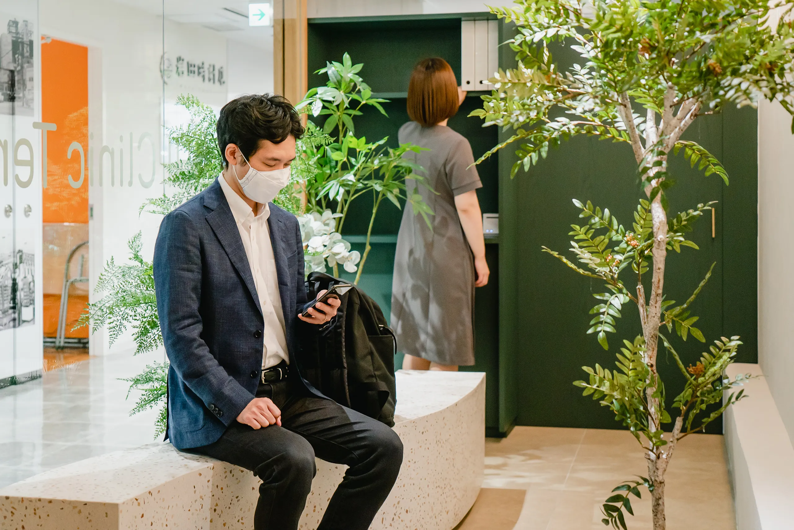 By enabling patients to complete reservations and medical questionnaires entirely through an app, we were able to eliminate the need for a traditional reception desk. This innovative approach allowed us to create a remarkably spacious and relaxed waiting area, even within a minimal footprint. An S-shaped bench, integrated planting, and a thoughtful lighting scheme work in concert to establish a calming environment where patients can feel at ease, even for a short visit.